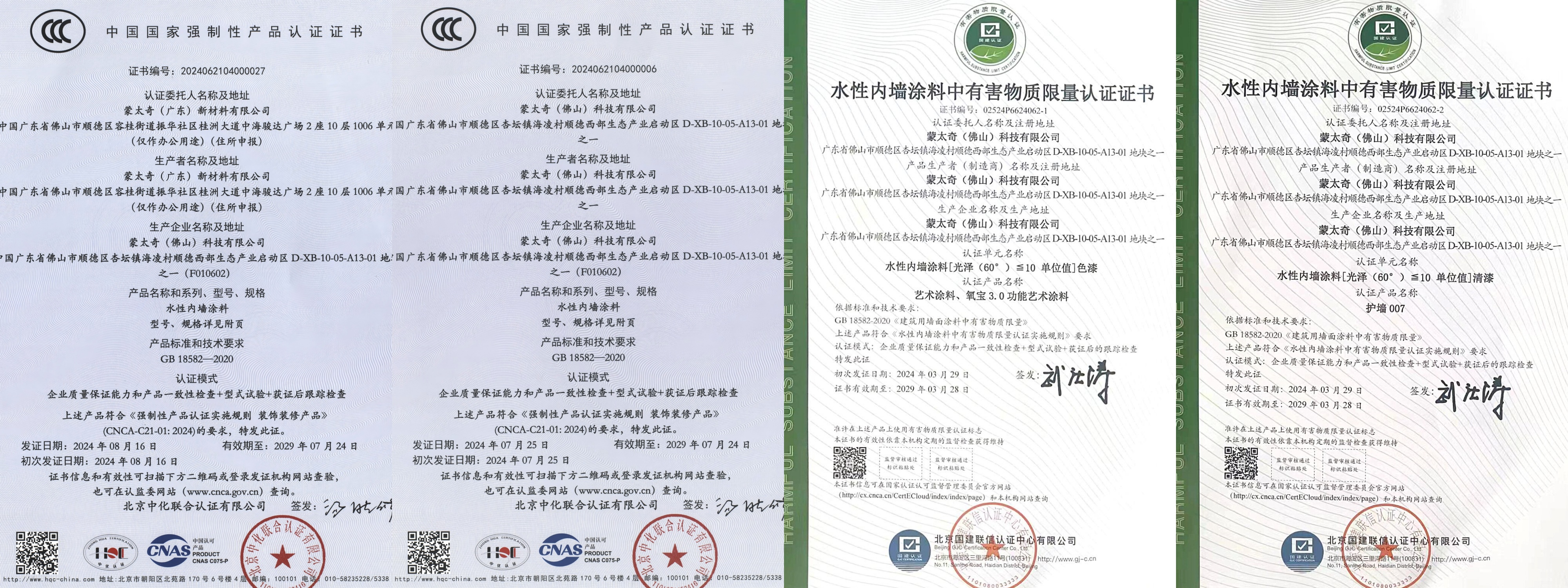 在此專利獲準前,蒙太奇已擁有14項專利,涵蓋藝術涂料、無機涂料等產品發明專利與專業制備設備實用新型專利。在嚴格遵循國家標準、通過基礎認證的基礎上,蒙太奇主動對標國際先進水平,成為行業首批獲得《水性內墻涂料中有害物質限量認證》及3C強制產品認證的雙資質品牌。這些技術成果與權威認證的積累,不僅印證了蒙太奇的研發實力,更為藝術涂料行業的標準化建設添磚加瓦,推動行業邁向新高度。